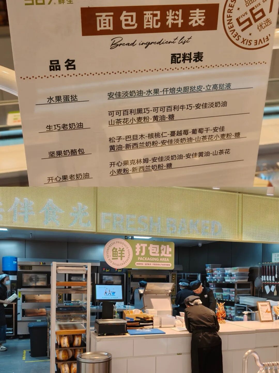 烘焙区同样延续“透明化”思路,后台直接设置开放式烤箱,实时展现烤制过程,货架上方的招牌还专门标注了烘焙品配料表,明确标注奶油&黄油选用安佳品牌、奶粉为新西兰进口产品。