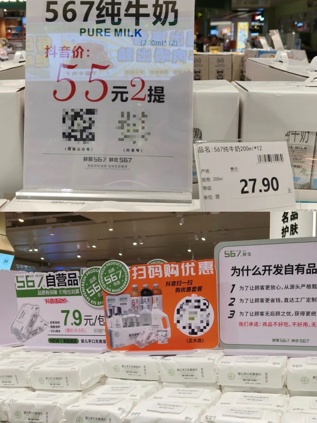 店内多款商品的标签上均标注“抖音特价”“扫码购优惠”等提示,例如自营纯牛奶的标签明确标注“抖音价55元2提”,通过抖音导流打通线上线下流量,紧跟商超线上化的行业潮流。