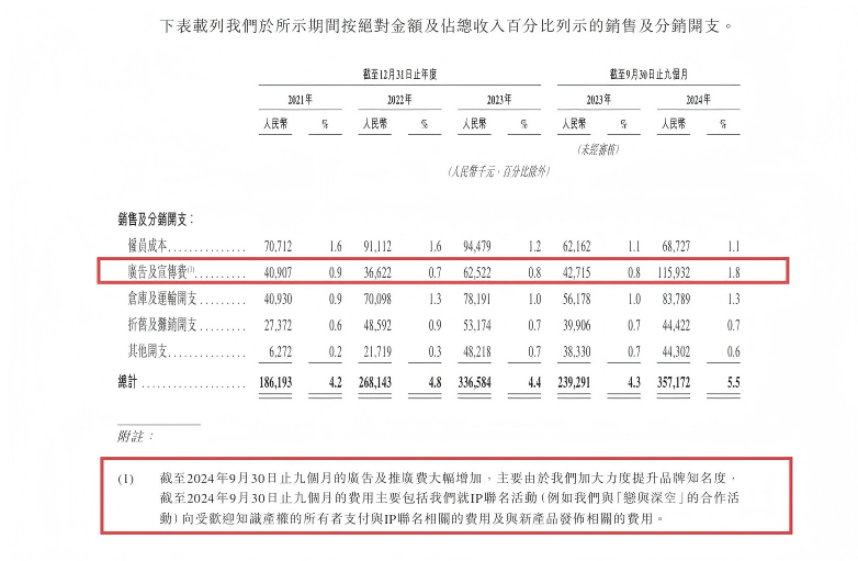 比如古茗在招股书中披露,2024年广告及宣传费较上年同期增长超过7000万元,官方指出,该时间段内费用的暴涨,主要与IP联名有所关联,且给出了具体案例,“如我们与《恋与深空》的合作活动。”