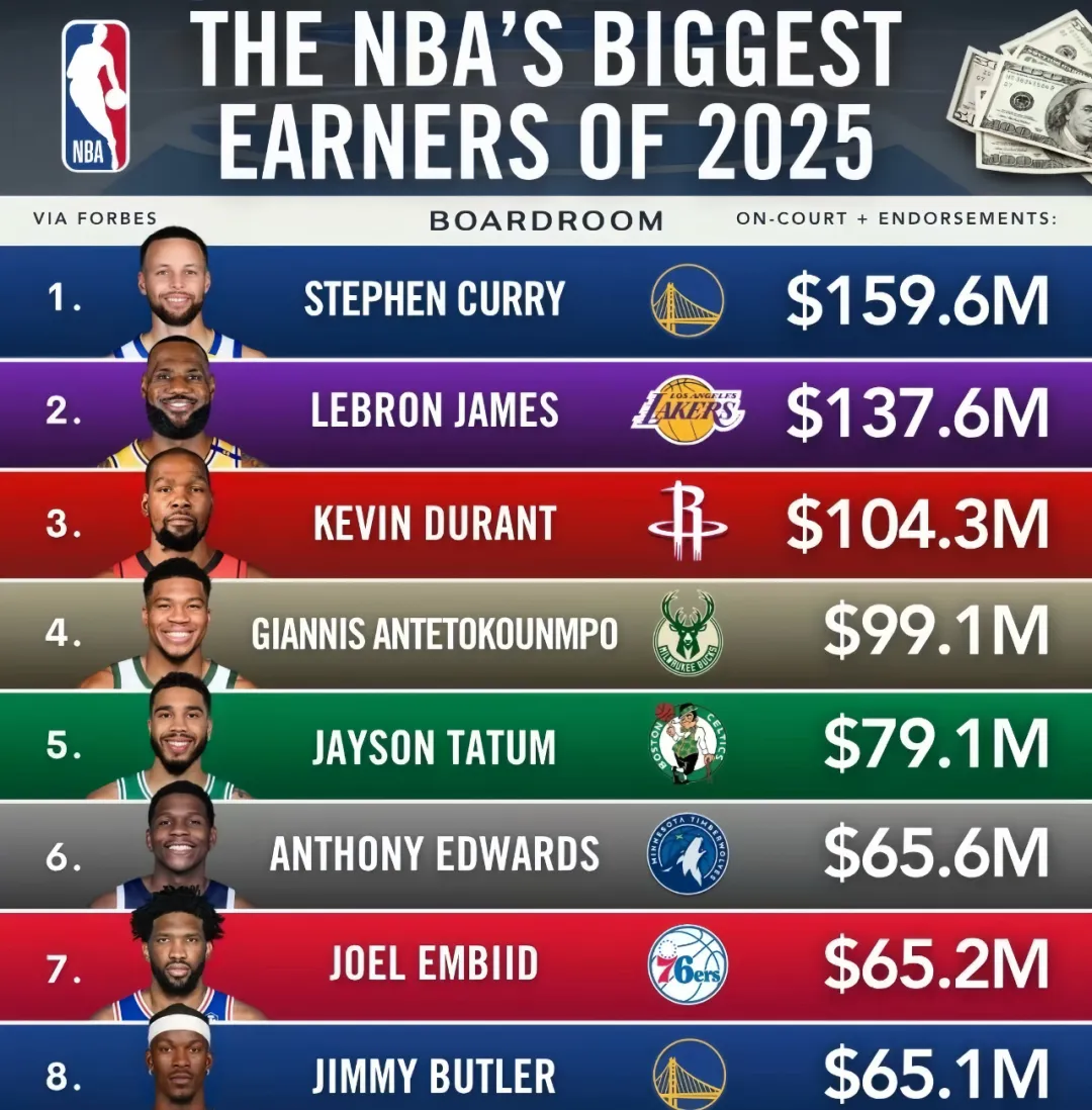 而库里身价却丝毫不减。福布斯最新统计,库里2025年赛季总收入预计达1.596亿美元,首次超越詹姆斯成为NBA收入最高的球员。