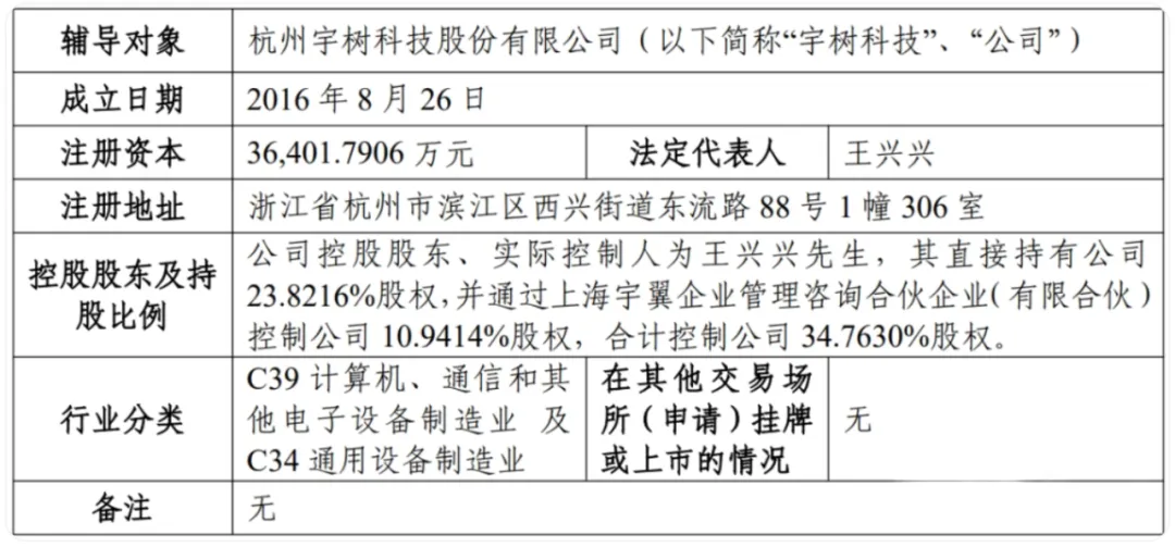 辅导备案报告显示,宇树科技控股股东、实际控制人为王兴兴,王兴兴直接持有公司23.8216%股权,并通过上海宇翼企业管理咨询合伙企业(有限合伙)控制公司10.9414%股权,合计控制公司34.7630%股权。
