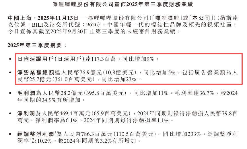 哔哩哔哩三季度财务报告显示,2025年第三季度B站总营收为76.9亿元,同比增长5%;净利润4.694亿元,去年同期则录得净亏损7980万元;经调整净利润为7.863亿元,同比增长233%,经调整净利润率为10.2%,高于去年同期3.2%。