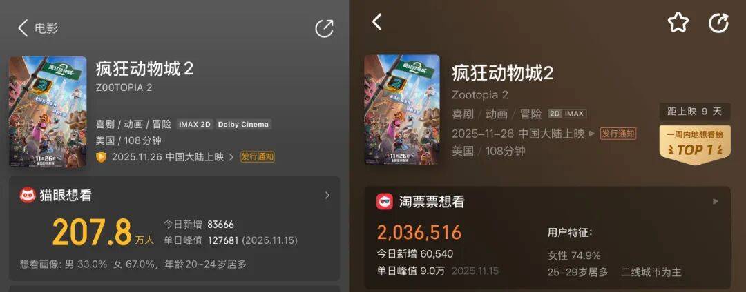 截至目前,影片在猫眼取得了超过200万+的想看人数,位列历史第三的位置,仅次于今年另一部现象级作品《731》以及《唐人街探案3》。同时,影片超越《复仇者联盟4》同样也是一大壮举,预示着《疯狂动物城2》成为有史以来,最受期待的好莱坞电影。另一边,淘票票同样也成功拿到了200万+的想看人数。