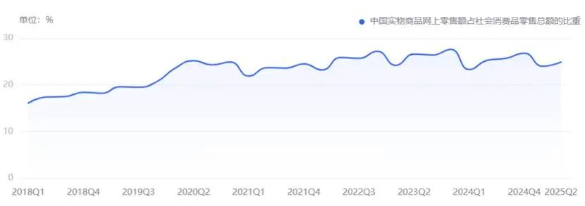 从结构来看,自2020年起,受特殊时期带来的线上消费红利推动,电商行业经历了一波线下商品向线上转移的渗透浪潮。但自2021年至今,电商线上渗透率已基本见顶,实物商品网上销售额占社零的比重长期稳定在24%-27%区间。