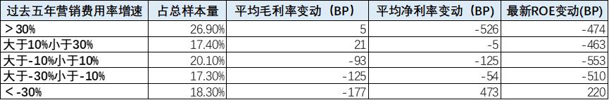可以看出,以今年为基准回推过去五年,那些让利消费者、降低营销费率的企业,长期ROE与净利率反而出现提升;而营销费用大幅增加的消费企业,过去五年平均净利率下滑最为明显。