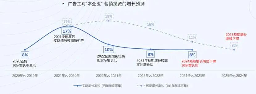 这并非个例。《2025中国数字营销趋势报告》调研显示,2025年广告主对营销投流持积极态度的比例下降14%,持悲观态度的比例上升11%。同时,广告主对营销带动增长的预期也从2021年的17%下滑至8%左右。