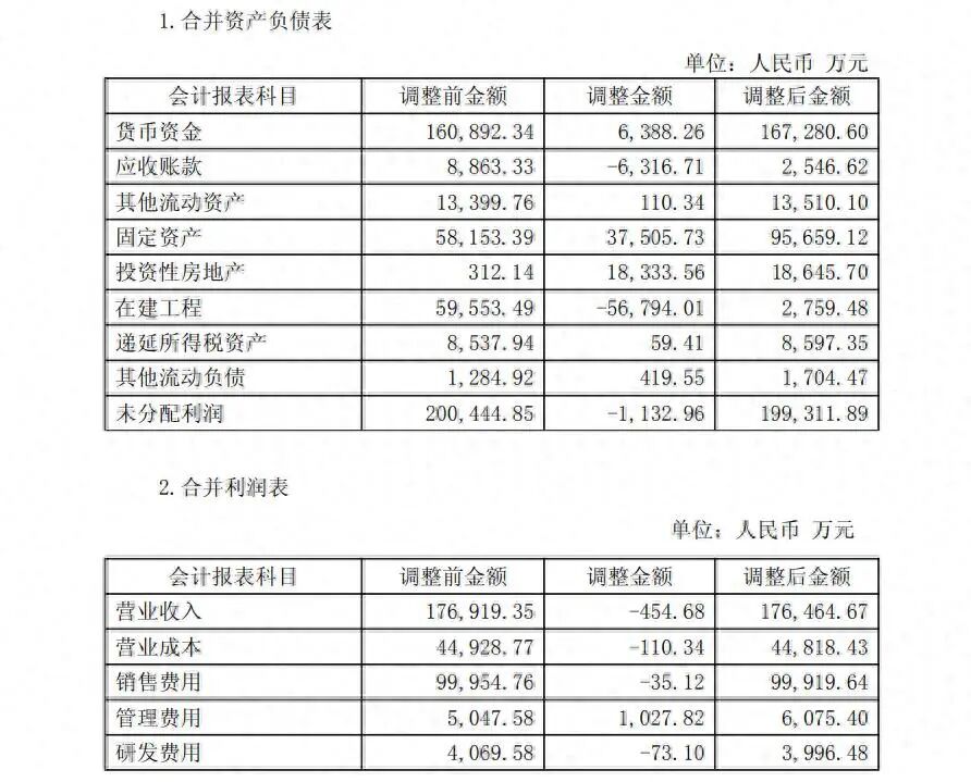在合并资产负债表方面,同期,公司在建工程多算了约5.68亿元,调整后为2759.48万元;应收账款多算了6316.71万元,调整后为2546.62万元。