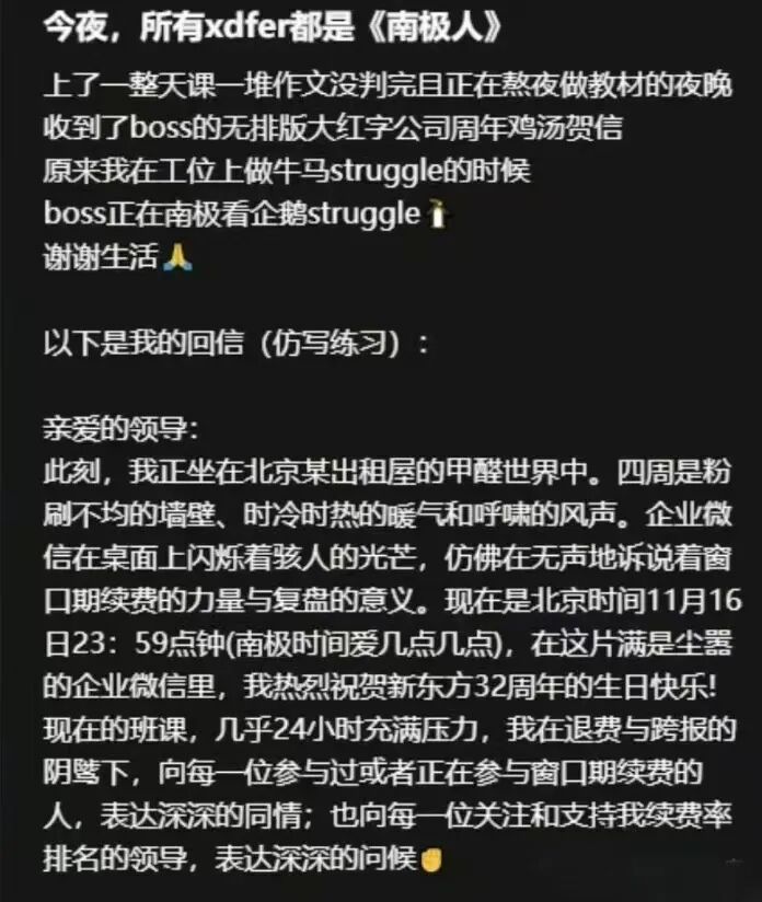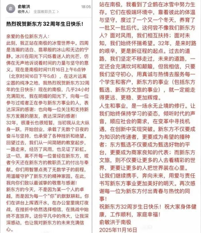 最后想对每一位伙伴说:感谢你选择与我们并肩同行,感谢你在风雨中不离不弃。32岁的新东方,因为有你而更有力量;未来的漫漫长路,我愿与你继续携手,带着初心与热爱,像南极的星辰一样,坚定而温暖地发光。