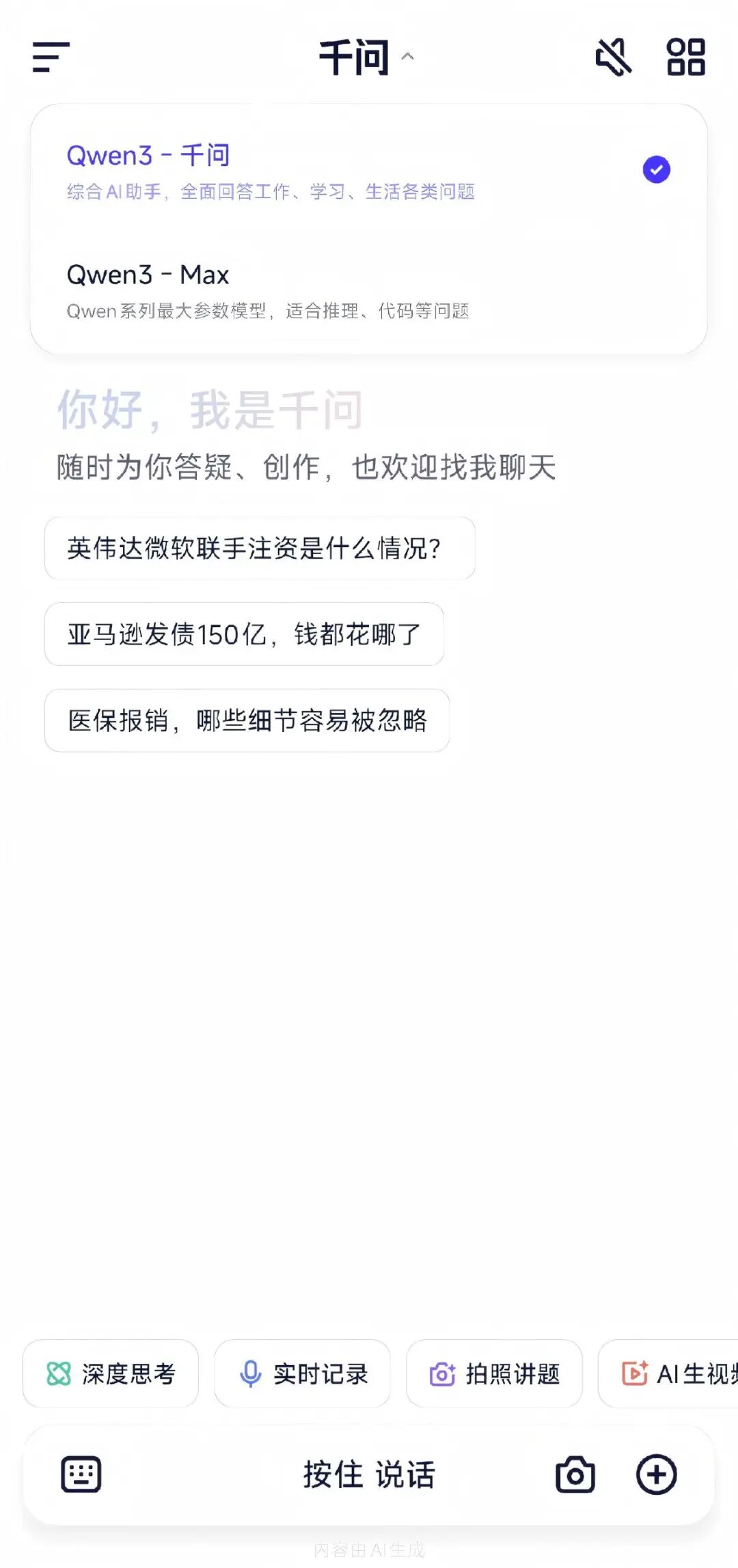 升级后的千问APP产品设计与同类产品相似,在功能上较通义有所增加,包括AI视频、AI绘图、音视频速读、实时记录、AI笔记、深度研究等。
