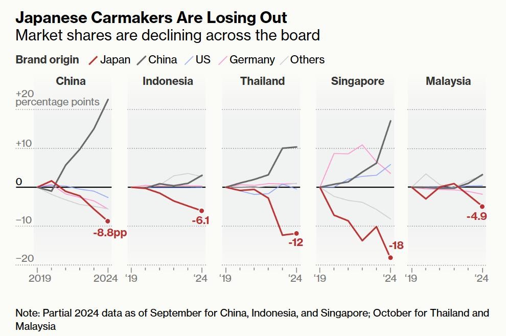 根据彭博社分析,从2019—2024年,日本汽车厂商在中国、新加坡、泰国、马来西亚和印尼损失的市场份额是全球所有汽车厂商之最。在马来西亚的销量下降了5%,在印度尼西亚下降了6%,在泰国下降了12%,在新加坡更是暴跌了18%。