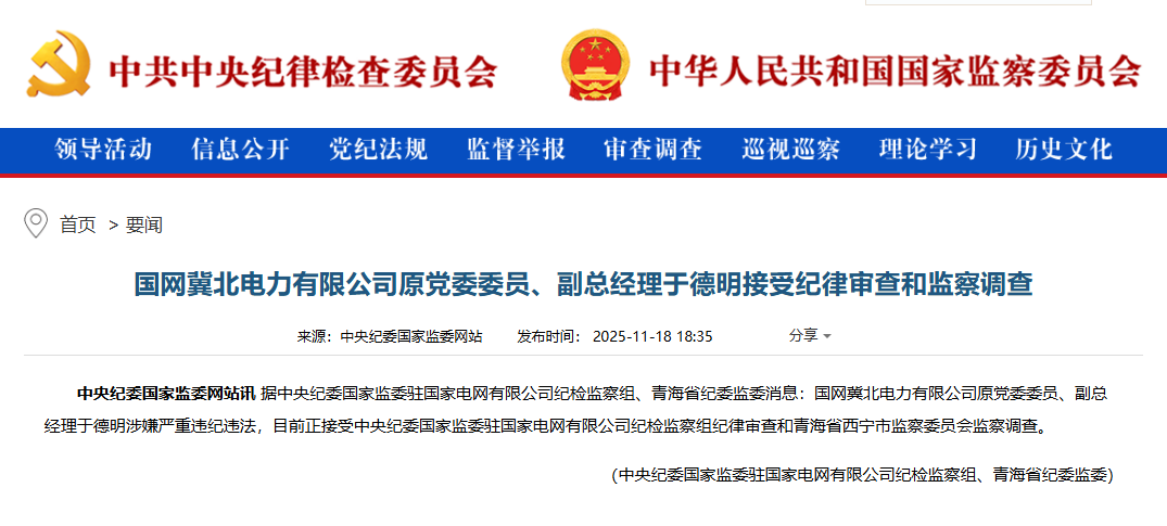 11月18日,中央纪委国家监委网站发布消息,国网冀北电力有限公司原党委委员、副总经理于德明涉嫌严重违纪违法,目前正接受中央纪委国家监委驻国家电网有限公司纪检监察组纪律审查和青海省西宁市监察委员会监察调查。