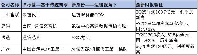 如工业富联(不止是果链,更是达链)、思科(不仅是园区交换机、而是数据高速传输大脑)、博通(通信芯片转型ASIC)、广达(PC代工王者到机柜代工巨头)……