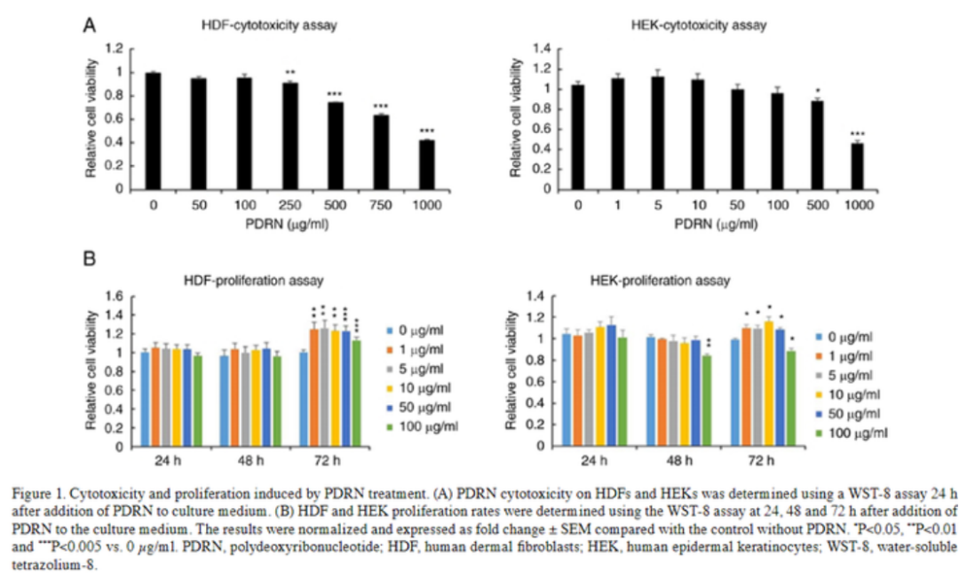 然而,发表于分子医学期刊《MOLECULAR MEDICINE REPORTS》的一项研究显示,PDRN存在明确的浓度上限,即当浓度提升至100μg/ml时,角质细胞增殖反而出现下降。这意味着,该成分并非添加越多越好。