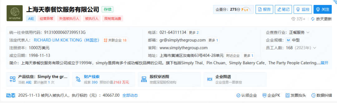 再往前,2024年底,有“上海泰国菜鼻祖”之称的simplythai天泰,南京、上海等多地关店,还被曝拖欠员工工资、断缴社保。(详情可阅读:经营困难,批量关店!“上海泰国菜鼻祖”无奈卖身)当时有报道称,或有新的经营方接手天泰。