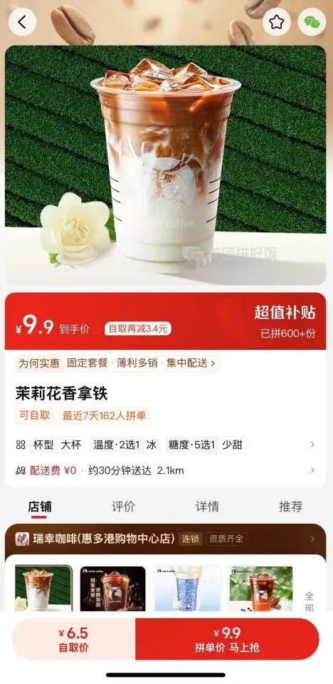 外卖战最激烈时,在美团拼好饭,用户外卖买一杯生椰拿铁要6.9元,自提一杯仅需3.5元。而这3.5元,瑞幸虽无需向平台支付配送费,但仍需按比例抽佣,无疑比过去的普通门店自提盈利低了不少。