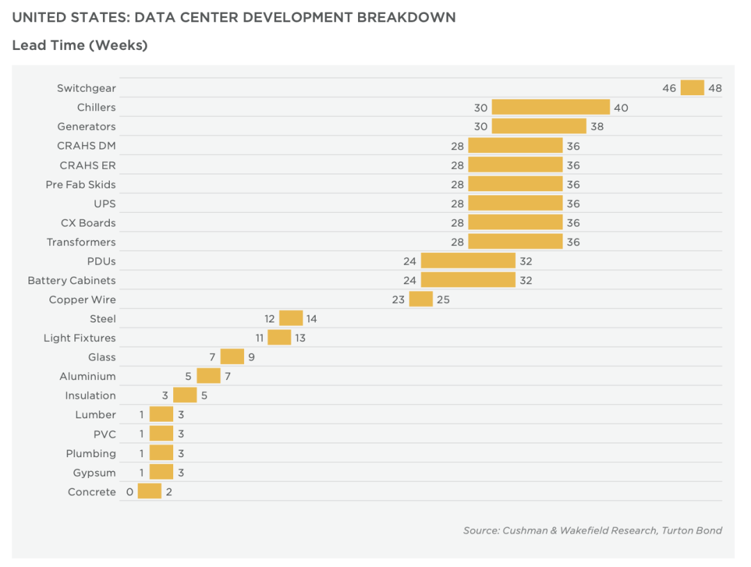 所以行业现在普遍共识不是缺GPU,而是缺能让GPU通电的地方。Cushman & Wakefield的2025报告提到,北美成熟市场已经全面进入电力短缺,变压器、UPS、switchgear的交付周期普遍拉到30–48周。