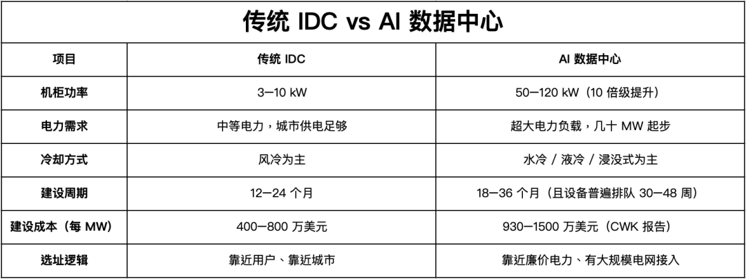 之前没有系统研究过数据中心,最近看了下,难怪这波AI浪潮传统IDC感觉连汤都没喝到,AI数据中心和过去IDC不是一个物种。传统机柜3–10kW,现在AI机柜动不动80–120kW,一个小型训练集群能把一个中型企业整栋机房的电直接压垮。