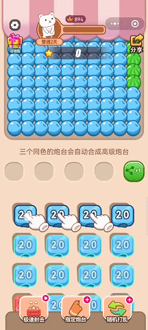 此外,《电了个炮》在玩法上加入合成要素,相同颜色的炮台可以进行3合1升级,升级后可以获得对应的炮台消耗数值,同时也空出一部分炮台设置位置。