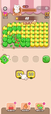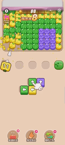 这一类素材的消除色块以平面形式呈现,与游戏内的消除玩法相似,主要展现出消除的速度,高速消耗的消除数值可能给玩家带来更多刺激感,同时在设置炮台层面上体现出游戏的策略性,以获得玩家的认同感。