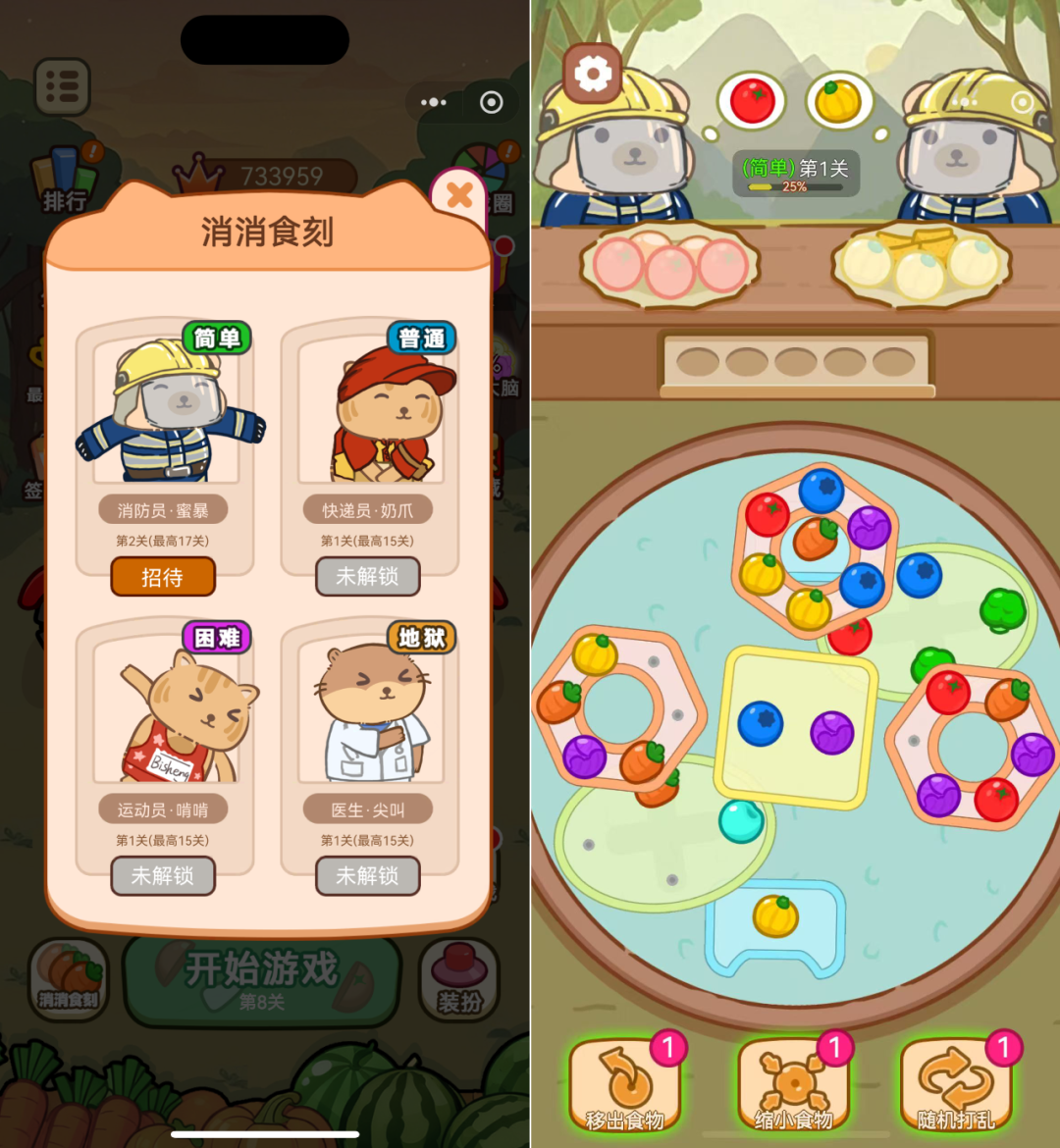 另外观察发现《电了个炮》在局外也加入了不少主流玩法,例如在“消消食刻”上,玩家需要通过类似“拧螺丝”的消除玩法来解锁角色、时装等局外养成内容。