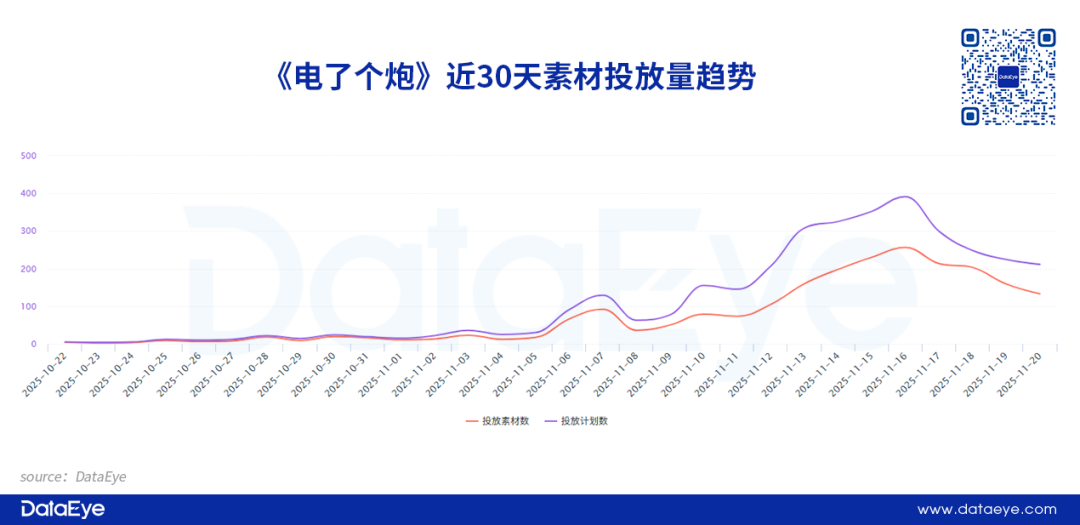 DataEye-ADX投放数据显示,《电了个炮》在10月21日才开始进行效果广告投放,日均投放量不足100条。直到11月6日,投放素材量有明显提升,而后持续提升,11月16日首个投放峰值。