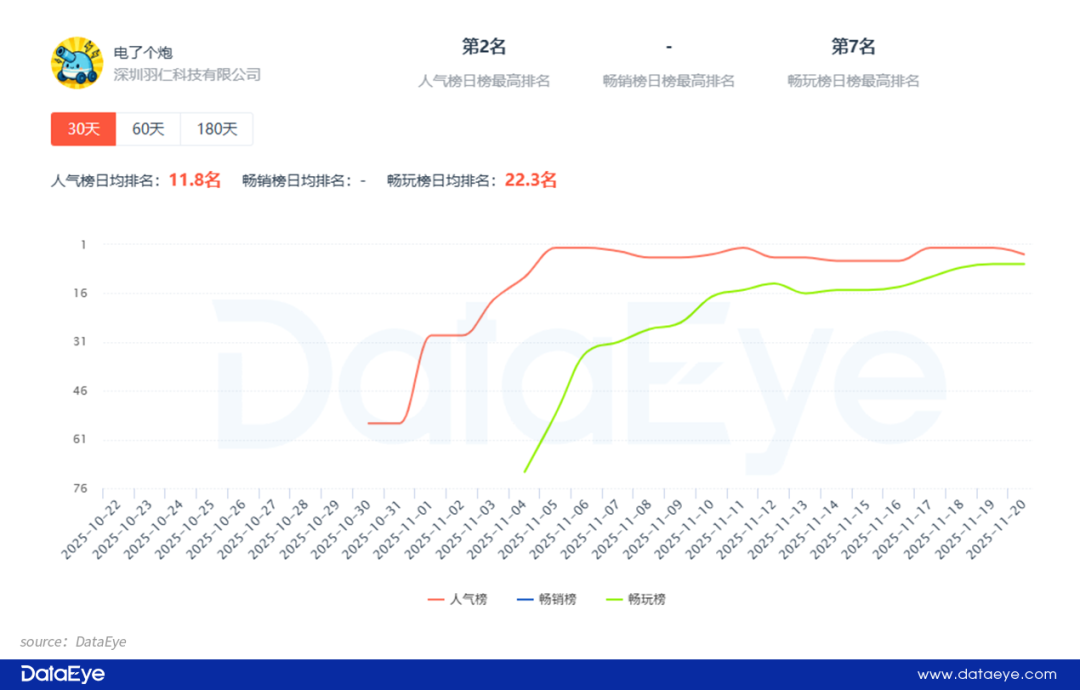 在畅玩榜方面,11月4日首次入榜并排名71名,但攀升速度迅速,两天后(11月6日)升至34名,随后进一步提升,在11月18日冲入TOP10,排名第8名。截至目前,《电了个炮》人气榜排名第9,畅玩榜排名第7名。