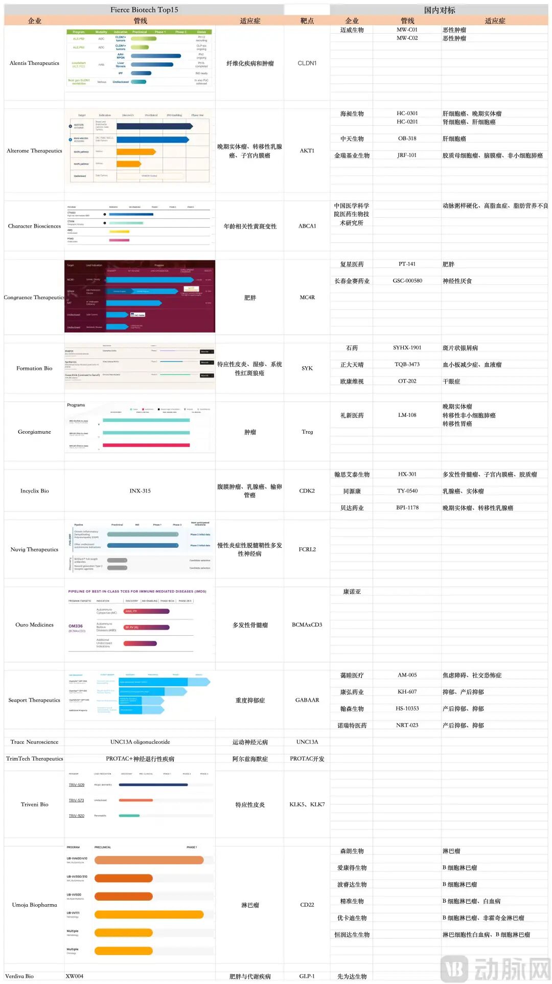 此外,由权威生物技术媒体Fierce Biotech每年发布的,旨在评选出当年在生物技术领域最具创新力和发展潜力的15家新锐公司的“Fierce 15”榜单,普遍被认为是行业创新风向标。可在2025年榜单中,如果按靶点和适应症来看,大多数入选企业的核心管线国内都有相应对标的企业,这也进一步凸显国内创新的前瞻性。