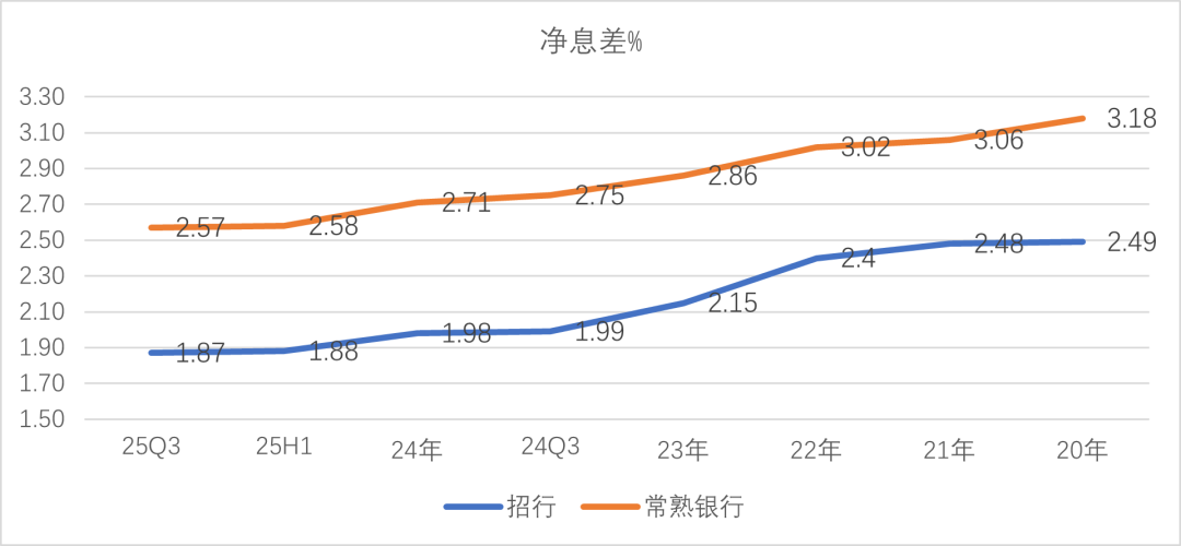 图:招商银行和常熟银行净息差走势 单位:%