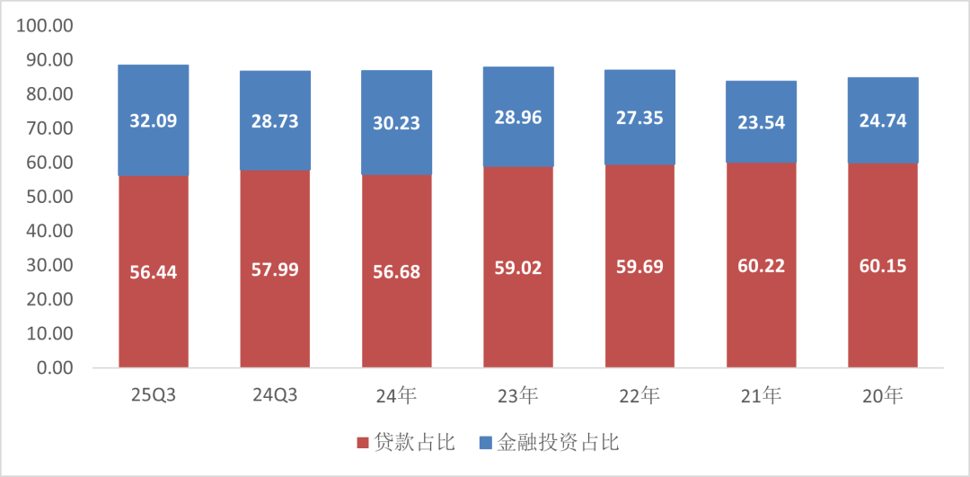 2025年三季度净息差为2.57%,较半年报下降1个基点。资产配置方面,63.84%为信贷资产,26.61%为金融投资。