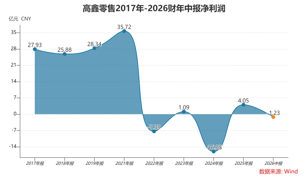 报告期内,高鑫零售实现营收305.02亿元,较同期的347.08亿元下降约12.1%。公司期内录得亏损1.23亿元,由盈转亏。尽管高鑫在上一财年已艰难扭亏,但2026财年中报仍然亏损的数据,表明其盈利能力尚未真正稳固。