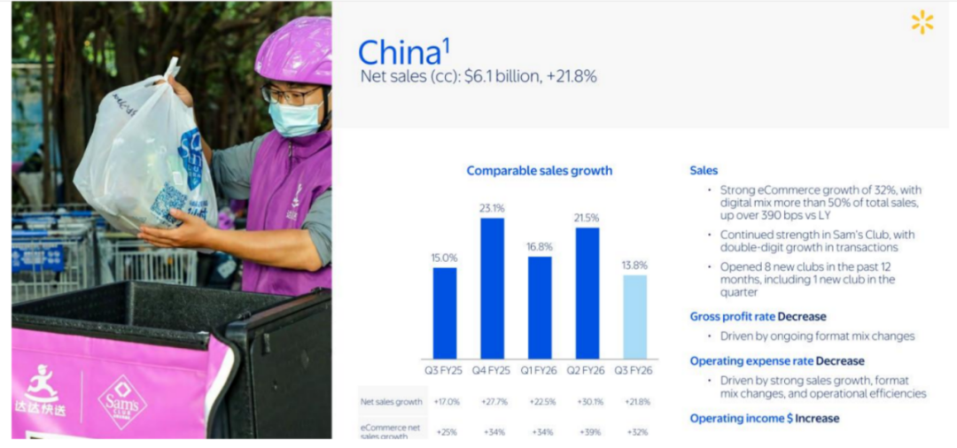 从最新业绩来看,其增长势头仍在延续,舆论未引发实质性业绩下滑,2026财年第三季度(2025年8月1日—10月31日)财报显示,沃尔玛中国市场的电子商务增长超过30%,山姆会员店销售额同比增长22%。