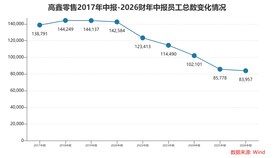 改革已初见成效,高鑫零售的员工成本从2024年同期的41.06亿元降至37.88亿元,员工总数从巅峰时期的14.42万人优化至当期的8.4万人,减少了超一半人员。