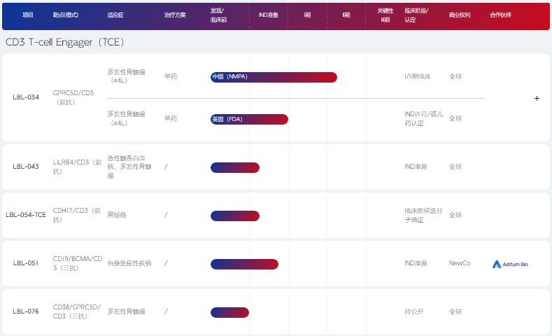此外,维立志博还布局有LBL-043(LILRB4/CD3)、LBL-051(CD19/BCMA/CD3)、LBL-054(CDH17/CD3)在研。其中,全球首创的CD19/BCMA/CD3三抗LBL-051通过NewCo模式与Aditum Bio合作,交易总额达6.14亿美元,创下国内临床前TCE管线授权纪录。