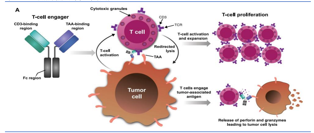 这其中,TCE通过CD3抗体端与T细胞表面的TCR-CD3复合物结合,完成T细胞激活,不需要经过抗原呈递细胞。T细胞被激活后,分化为细胞毒性T细胞,进而完成对肿瘤细胞的杀伤,因此杀伤机制更为直接。