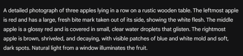 但这也造成了另外一个问题,提示词门槛被拉高了。我们回到一开始三个苹果的提示词上。