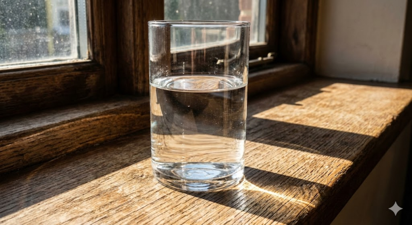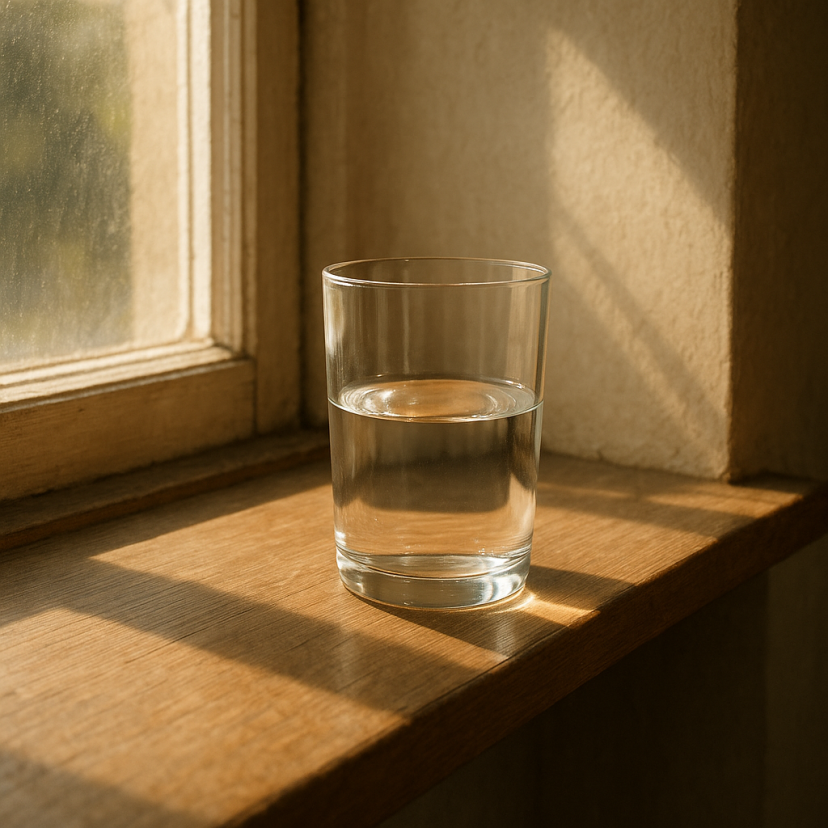 提示词“窗台上的半杯水,阳光从左侧射入”。