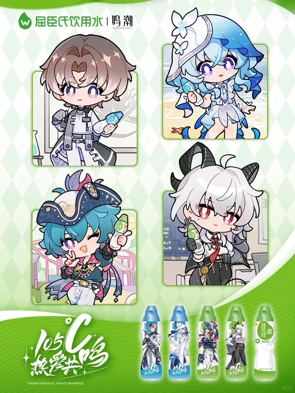 比如屈臣氏饮用水与《鸣潮》的联名,以“105℃热爱共鸣”为主题,不仅设计在线、周边质量过硬,还深入漫展、发起瓶盖抽奖等玩家互动,真正把联名做成双向奔赴的共鸣现场,展现出了品牌对二次元文化的尊重和诚意。