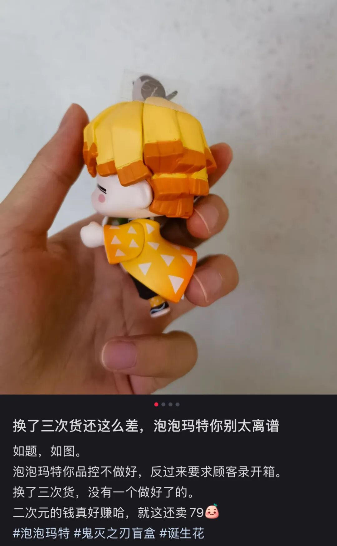 有时候,联名创意本身没问题,却败在了设计成品阶段。比如泡泡玛特联名小樱、《鬼灭之刃》等IP时,经常能刷到用户吐槽品控问题。
