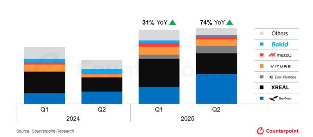IDC在2025年上半年的报告中提到,“2025年二季度智能眼镜市场出货渠道中,零售渠道(第三方渠道)出货量占比同比提升4.0%,直营店渠道(官方商城)占比同比提升4.4%”。
