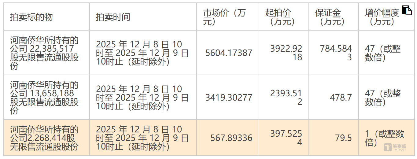 此次拍卖的关键信息明确:时间为12月8日10时至12月9日10 时(延时除外),平台为杭州市上城区人民法院淘宝网司法拍卖网络平台。3831.21万股股份被拆分为三笔,起拍总价6713.96 万元,约为市场总价9591.37万元的70%。