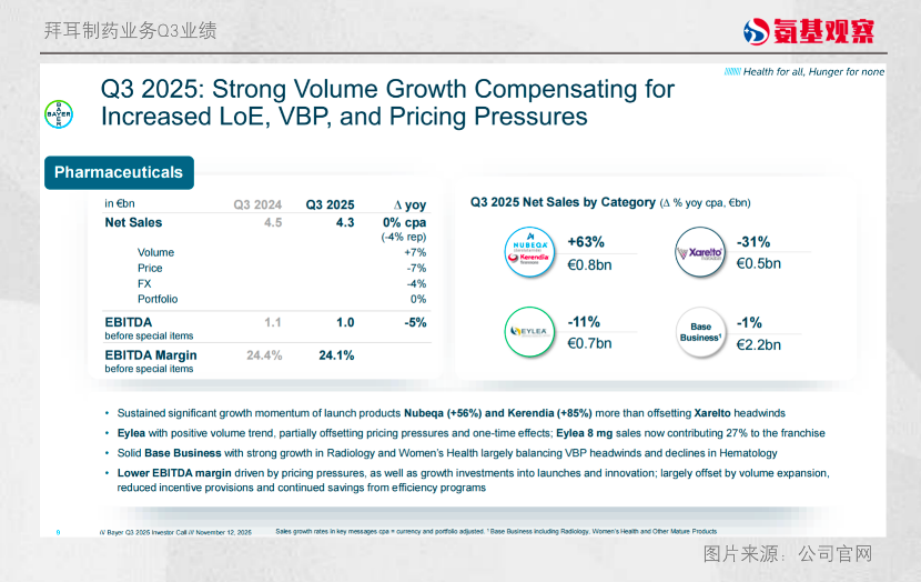 目前看,改革初见成效,得益于新药获批及核心药物销售的增长,拜耳正在重新获得投资者的押注。根据三季报,现有商业化创新药中表现突出的是前列腺癌药物Nubeqa和慢性肾脏病治疗药物Kerendia ,合计增长63%至8亿欧元。这一增长帮助抵消了核心老产品的下滑,其中Xarelto因专利悬崖,销售额下降31%至5亿欧元;Eylea因竞争恶劣,销售额下降11%至7亿欧元。