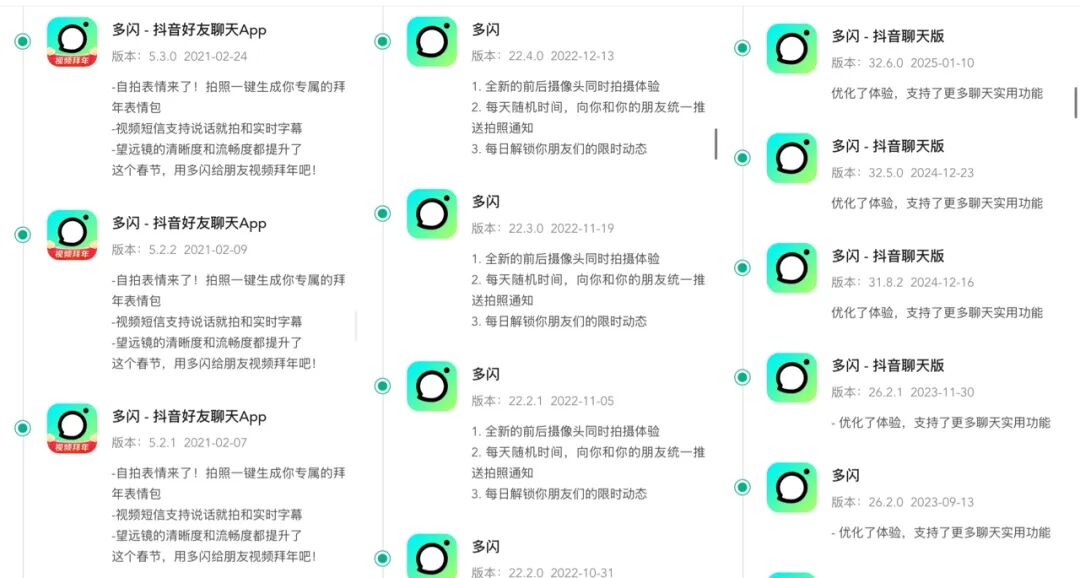通过查询多闪的版本记录,我们发现虽然早已淡出公众的视野,字节却从未停止对其迭代更新,背后是对于社交可能性的反复探索试验,而多闪则是那块始终未被放弃的“试验田”。