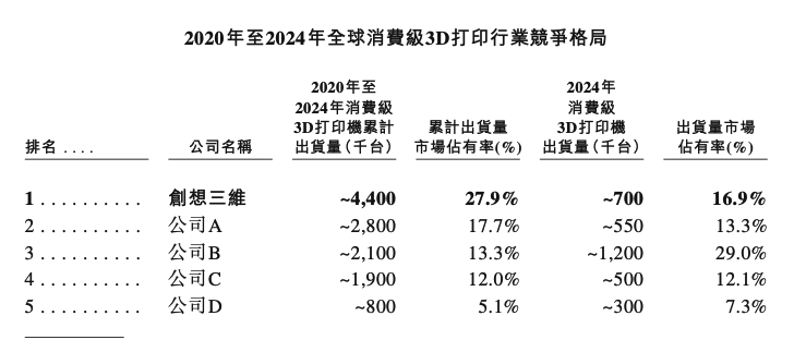 此外,创想三维的累计市占率暂居第一,但具体到2024年,创想三维单年度出货量约73万台,已被拓竹的120万台超越。智能派科技和纵维立方紧随其后,2024年出货量分别约55万台和50万台。