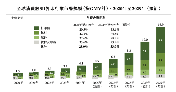 据灼识咨询数据,全球3D打印市场规模在2024年达到246.1亿美元(约1700亿元人民币),2024年至2034年的复合增长率(CAGR)有望达到18.5%。其中,消费级市场展现出更强爆发力:消费级3D打印市场规模达41亿美元,约占整体市场的16%,年复合增长率高达28%,预计2029年增至169亿美元。