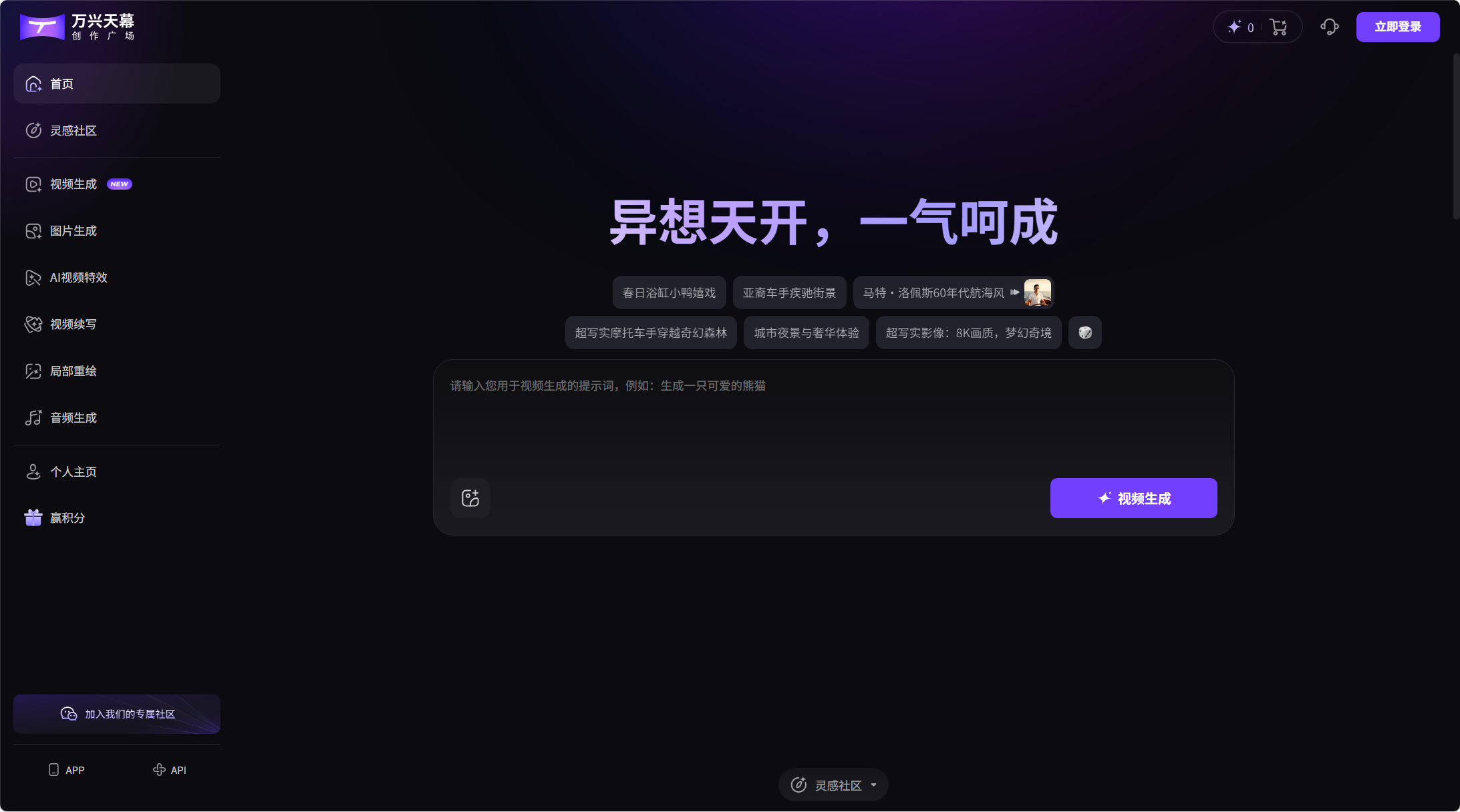 万兴科技旗下AIGC视频创作平台万兴天幕创作广场,提供音视频一站式AIGC创作