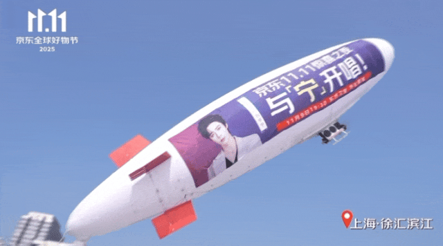 比如今年双11期间,上海变身成为一座真正的"痛城":黄浦江上巡游的巨型飞艇印着"京东11.11惊喜之夜·与「宁」开唱"的标语连续飞行三天;印有刘宇宁形象的"惊喜痛车"沿着上海20路公交线路,途经外滩、南京路、人民广场等核心地标巡游;同时,西湖天幕、上海美罗城等沪杭两地标志性大屏也同步呈现宣传画面。这场从空中到地面、从室外到室内、从上海到杭州的全域覆盖,成功引爆了社交传播。
