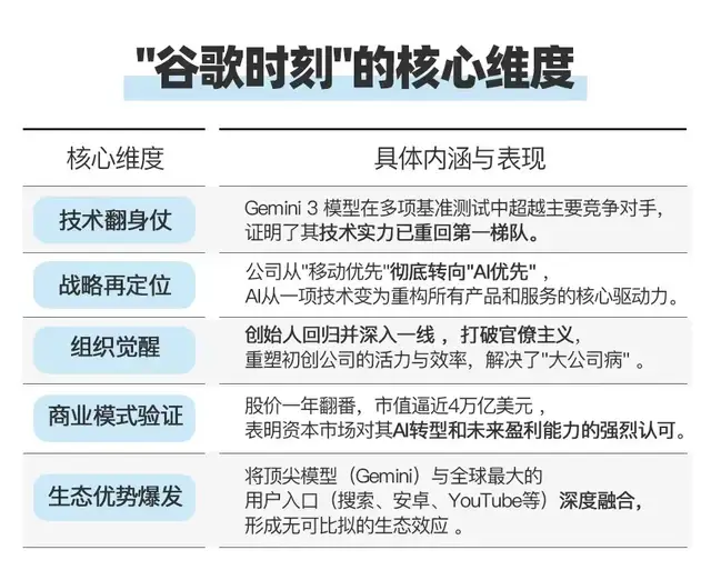 这不仅是一次股价或产品的成功,更是谷歌深刻的战略与身份转型,从搜索公司进化为AI 公司。我们将这一转折点定义为“谷歌时刻”。