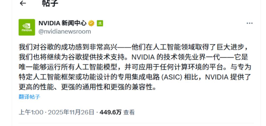 11月25日,英伟达在社交平台X上的这番声明,被视为对谷歌TPU近期备受关注的直接回应。