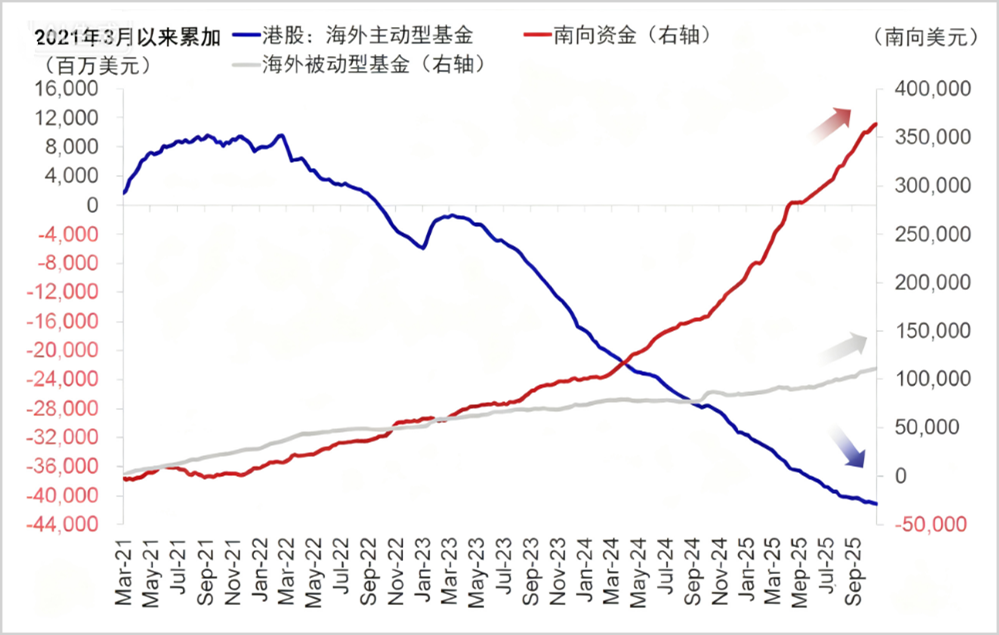 从主动型公募基金看,据中金统计,其总规模虽从2024年末的1.44万亿元增长至当前的2.12万亿元,但扣除指数上涨带来的净值增长后,实际净流入港股的增量不足1000亿元。