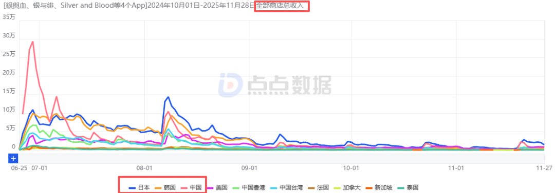 紧接着是6月26日全球同步上线的暗黑哥特幻想二次元RPG《银与绯》(移动端及PC端),其首月流水虽然冲至8011万,但此后开始快速下滑,目前月流水已经不足800万元,其累计流水约为1.7亿元,其中日本、韩国以及中国iOS端分别占比24.8%、19.66%、18.09%位列TOP3。